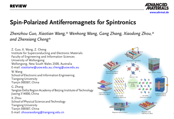 近期,国际材料科学著名期刊《Advanced Materials》(影响因子27.4)在线发表了题为《Spin-Polarized Antiferromagnets for Spintronics》的综述论文,系统总结了自旋极化反铁磁材料在自旋电子学领域的前沿进展与未来发展方向。该论文由永利集团官网王文洪教授团队与澳大利亚伍伦贡大学程振祥教授团队联合完成,其中公司青年教师周小东特聘副研究员与伍伦贡大学王啸天、程振祥教授为共同通讯作者。该研究工作得到了国家重点研发计划物态调控专项“强自旋轨道耦合反铁磁材料物态调控及原型器件”(2022YFA1402600)等项目的有力支持。论文链接:https://doi.org/10.1002/adma.202505779。